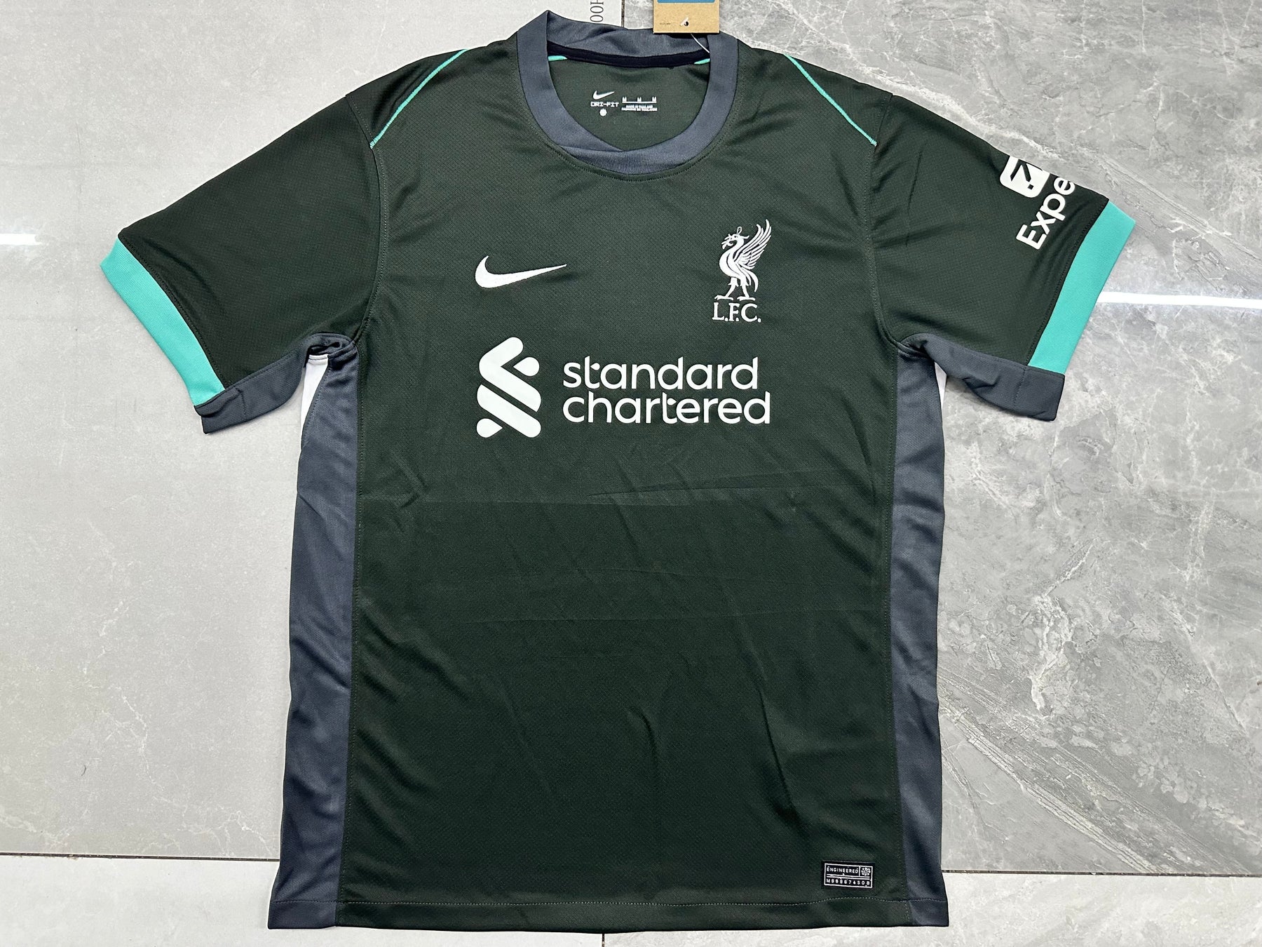 Support Liverpool met het officiële uit shirt voor het seizoen 2024/25. Dit stijlvolle Nike-shirt is uitgevoerd in een gedistingeerde donkergroene kleur met mintgroene accenten. Het shirt combineert innovatie en comfort met een strak, modern ontwerp en is perfect voor elke fan die zijn steun voor The Reds wil tonen, zowel in het stadion als daarbuiten.